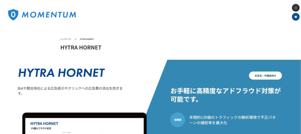 Momentum「HYTRA HORNET」は、日本のMomentum株式会社が提供するリスティング広告向けアドフラウド対策ツールです。同社は国内老舗のアドフラウド対策ベンダー。JICDAQ第三者認証を取得しています。