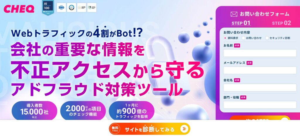 CHEQ(CHEQ AI Technologies)は、イスラエルのCHEQ AI Technologies Ltd.が提供するGo-to-Marketセキュリティプラットフォームです。細分化されたカテゴリーと2000項目以上のチェック項目でテストをリアルタイムで実施し、大手広告媒体でも捉えられないBotを検知します。
