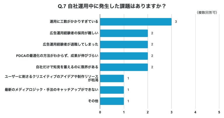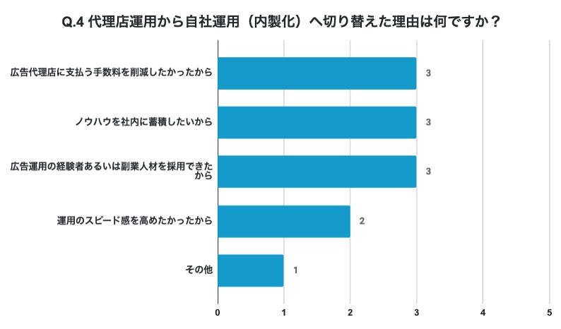 「広告代理店に支払う手数料を削減したかったから」「ノウハウを社内に蓄積したいから」「広告運用の経験者あるいは副業人材を採用できたから」はそれぞれ3人の方が、「運用のスピード感を高めたい」は2人の方が選択しました。