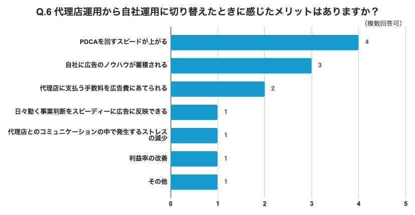 Q4「自社運用に切り替えた理由」とQ6「代理店運用から自社運用に切り替えたときに感じたメリット」がリンクしており、元々代理店運用時代に課題として感じられていた、「自社へのノウハウの蓄積」、及び「運用スピードの改善」という点においては、クリアした企業が多いと言えそうです。