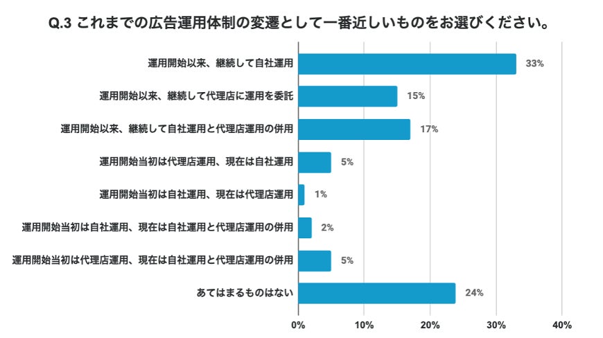 【調査】広告運用体制は「代理店委託」と「自社運用」がほぼ同程度。「運用経験者の採用・確保」の課題解決が事業フェーズにマッチした柔軟な体制選択の鍵に