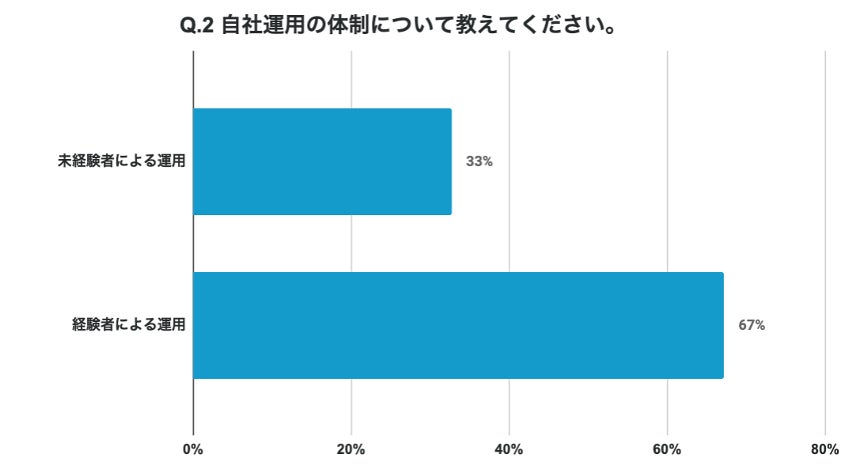 なお、Q1で「自社運用」を選択した30名に、運用スタッフについて聞いたところ、「経験者による運用」が6割以上と高い割合を示しています。広告運用の経験者を確保できるかが、自社で広告運用を実施できるかが大事なポイントになっているようです。