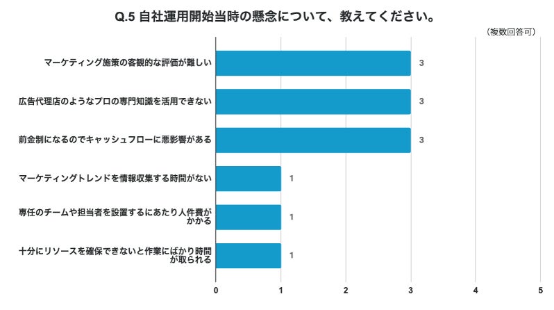 自社運用に切り替えた後に感じた、代理店運用のメリットとしては、「運用を任せることで空いた時間を他の業務に費やせる」という「リソース」面が最も多く選択されました。結果にQ4の自社運用開始当初の懸念は、「プロの運用ノウハウ」が一番高い結果であり、開始前と後で感じるメリットの内容に違いがあることがわかります。