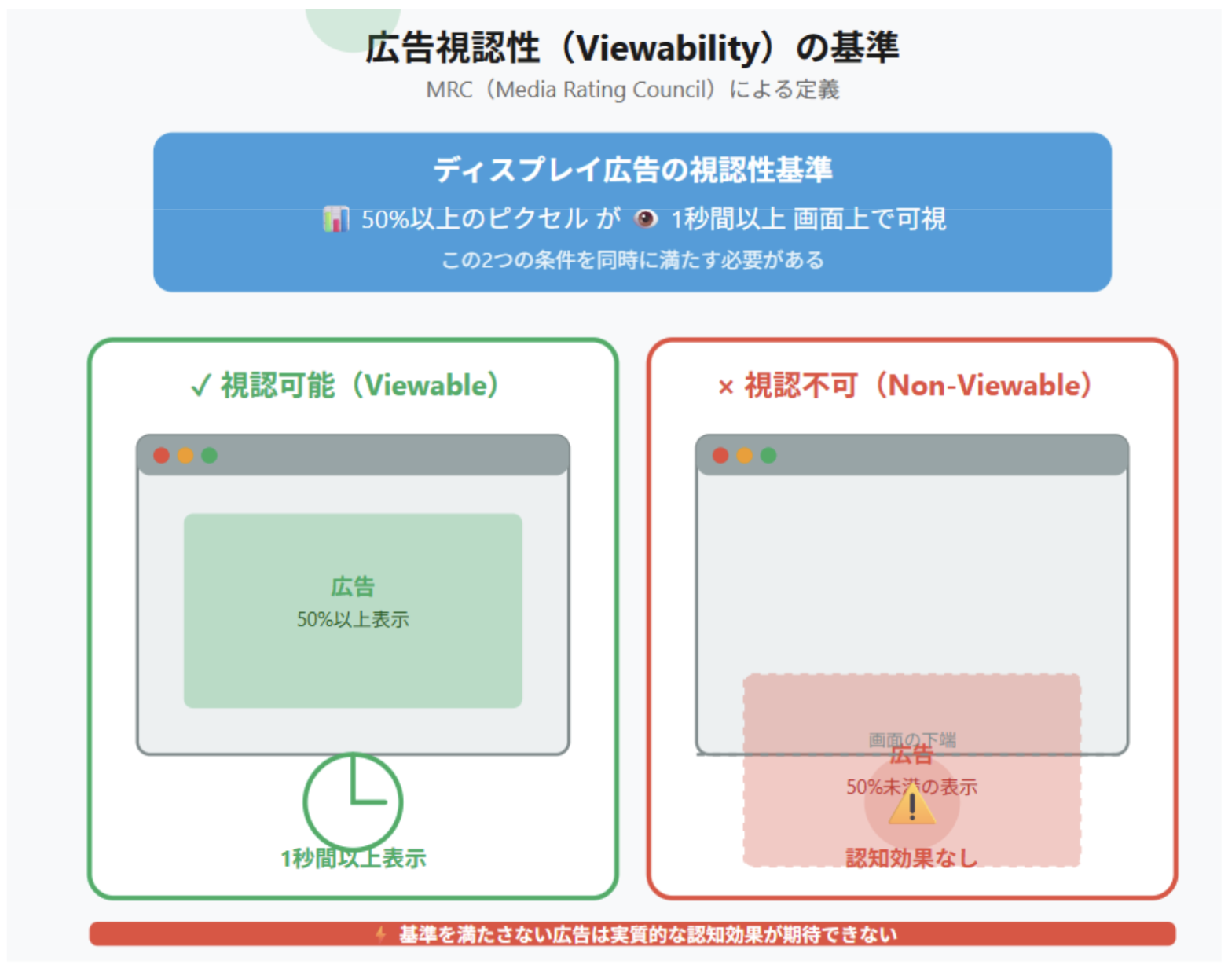 また、広告が「視認された」と見なされるための条件を測定するビューアビリティも、広告効果を判断するうえで欠かせない指標です。MRC(Media Rating Council)によれば、ディスプレイ広告の視認性は「50%以上のピクセルが、少なくとも1秒間、画面上で可視であること」と定義されています。この基準を満たしていなければ、いくら広告が表示されても、実質的な認知効果は期待できません。