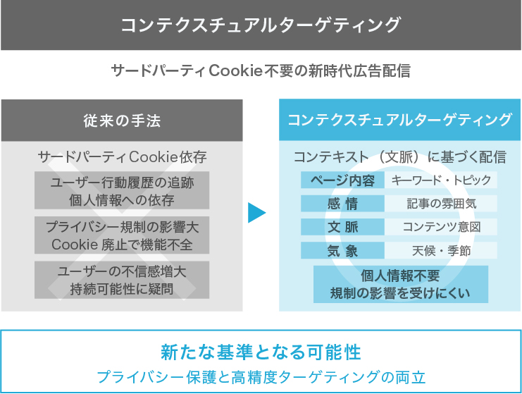 一方、サードパーティCookieに依存せず、高精度なターゲティングを可能にする手法として、コンテクスチュアルターゲティングが再び注目を集めています。これはユーザーの行動履歴ではなく、ページの内容や文脈、感情、気象といったシグナルに基づいて広告を配信する手法です。個人情報に依存しないため、規制強化の影響を受けにくく、今後の新たな基準となる可能性があります。