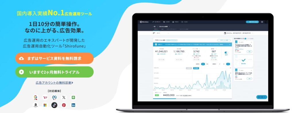 Shirofuneは、リスティング広告やディスプレイ広告など、複数の広告チャネルを一元管理し、自動で最適化できる運用支援ツールです。Google広告、Yahoo!広告、Facebook広告、Amazon広告といった主要媒体に対応し、入札の調整、予算の配分、パフォーマンスの分析と改善提案まで、日々の運用業務を高い精度で自動化します。