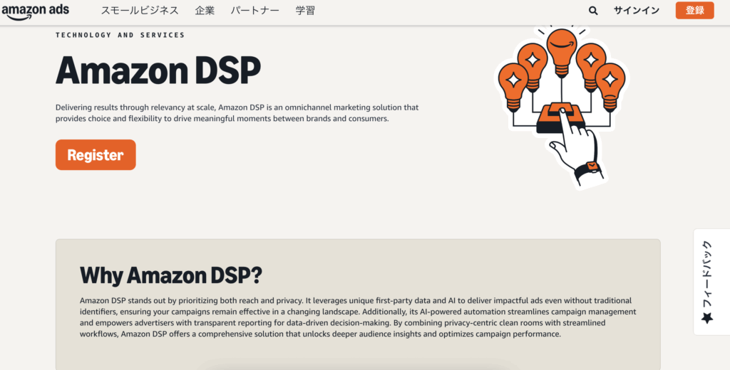 代表的なサービスはAmazon DSPです。Amazon DSPは、Amazonが保有する購買データを基盤に、Amazon内外のサイトへ広告を配信できる環境を提供しています。ユーザーの購買履歴や閲覧傾向をもとに、購買意図の高い層へ的確にリーチできる点が強みです。