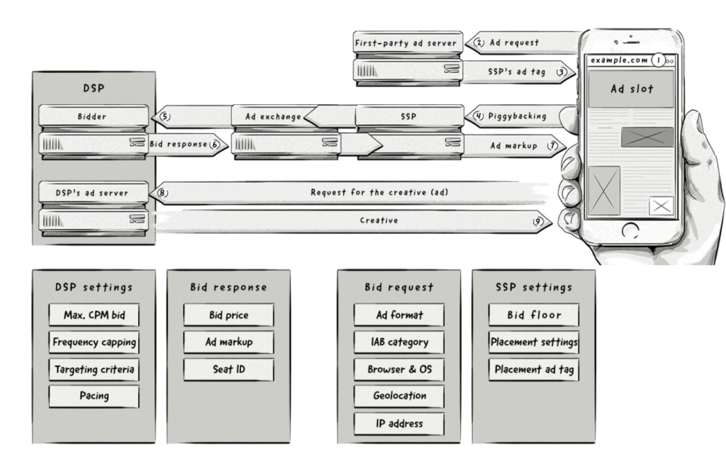 2000年代後半以降は、リアルタイム入札(RTB)技術の登場が転機となりました。広告枠が1インプレッション単位でオークション形式に取引されるようになり、配信の自動化と精度が飛躍的に向上。DSP・SSP・アドエクスチェンジといった現在のアドテク基盤が整備されました。