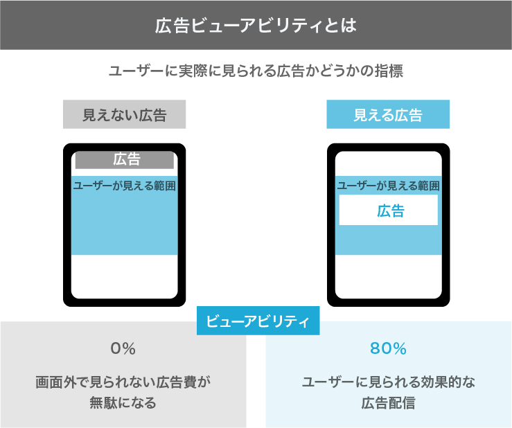 ビューアビリティの観点も重要です。ビューアビリティとは広告の可視性を示す指標であり、広告が実際にユーザーの視界に入った割合を意味します。IAB(インタラクティブ広告協会)の基準では、ディスプレイ広告はピクセルの50%以上が1秒以上表示された場合にビューアブルと定義されます。