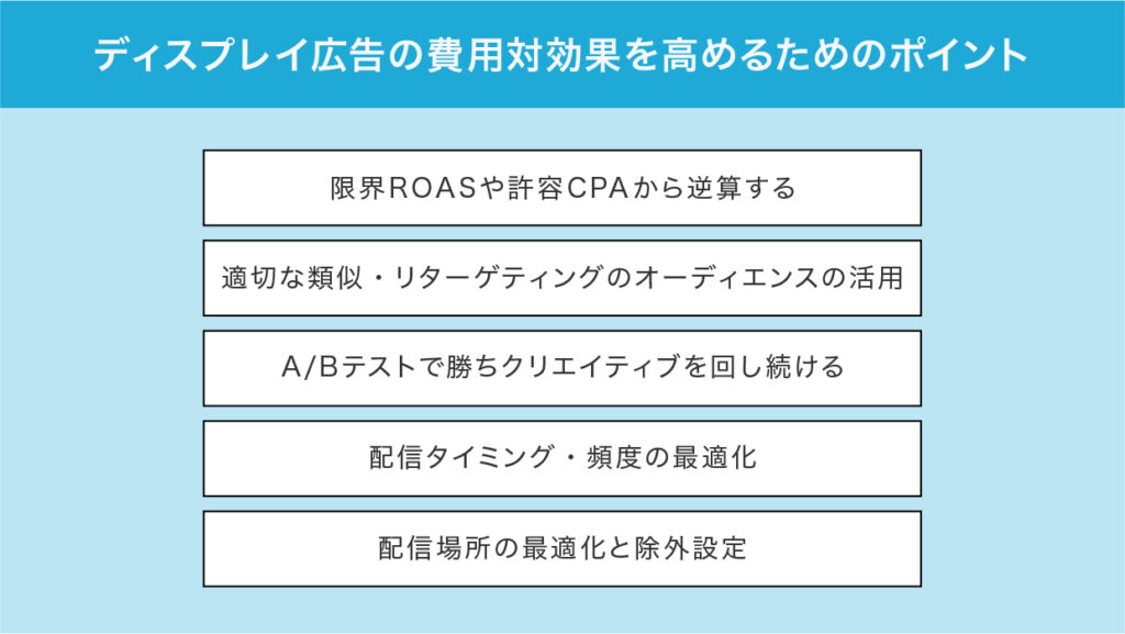 ディスプレイ広告の費用対効果を高めるためには、配信量を増やしたり、予算を増額したりするだけでは不十分です。むしろ、限られたリソースの中、どのように精度高く成果を出すかを突き詰める運用が求められます。ここでは、費用対効果を高める5つのポイントを見ていきましょう。