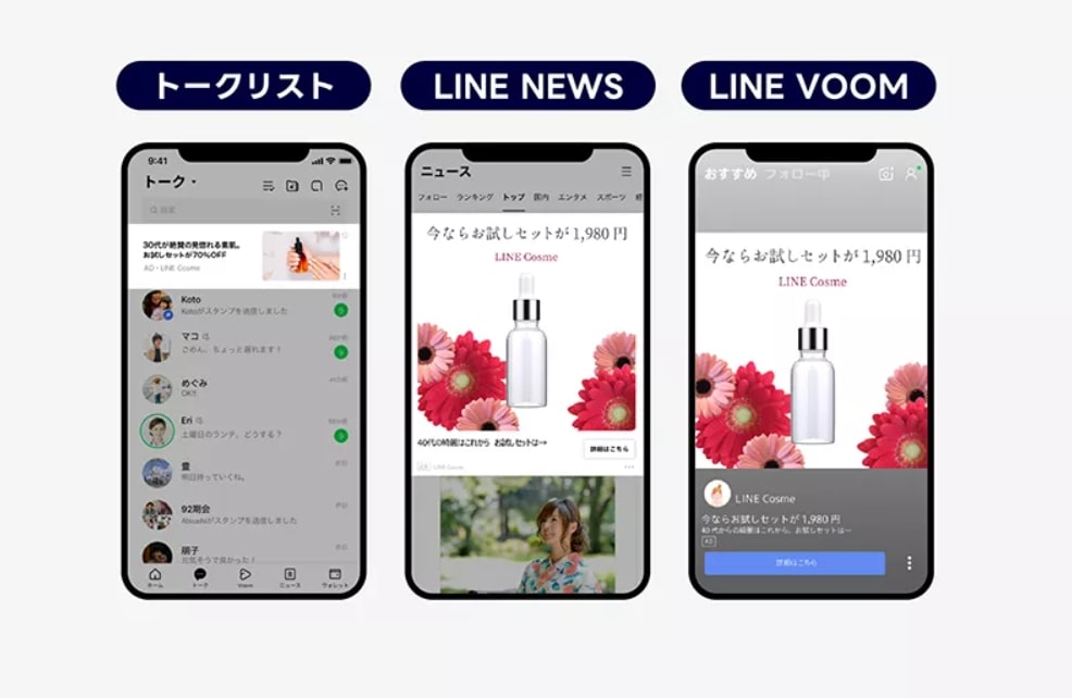 たとえば、LINEの使用中にディスプレイ広告を目にし、興味を持って、そのまま購入するといった具合です。そのため、美容製品やアパレル、サプリメントなどの突発的に購買意欲が発生し、ビジュアルでの訴求に強い商材に向いています。