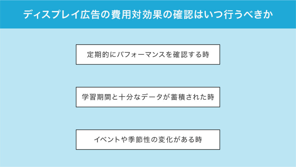 ディスプレイ広告の費用対効果の確認は、広告配信の成否を見極め、次の一手を適切に判断する上で欠かせない工程です。ただし、タイミングを誤ると、正確なデータが得られず、判断を急ぎすぎて逆効果になることもあります。以下では、費用対効果の確認を行うべき3つのシーンを解説します。