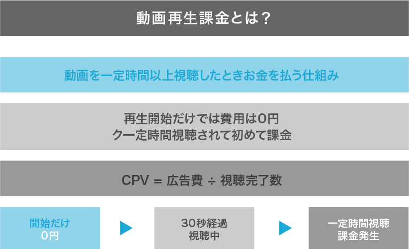 代表的なモデルは、TrueViewインストリーム広告における30秒以上の視聴、または広告内リンクのクリックでの課金です。動画が30秒未満の場合は、最後まで再生された時点で課金対象となります。ユーザーが広告をスキップした場合には費用が発生しない点が、他の課金方式との大きな違いです。