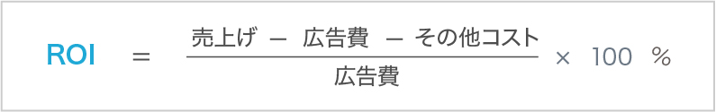 ROIは「広告費を含む投資に対する利益」の割合を示す指標で、次の式で算出されます。