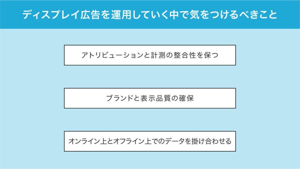 ディスプレイ広告を日常的に運用していくなかでは、費用対効果を高めるだけでなく、成果の正しい評価やブランドの保護、そして将来を見据えたデータ活用にも注意を払う必要があります。以下では、ディスプレイ広告の運用で気をつけるべき3つのポイントをご紹介します。