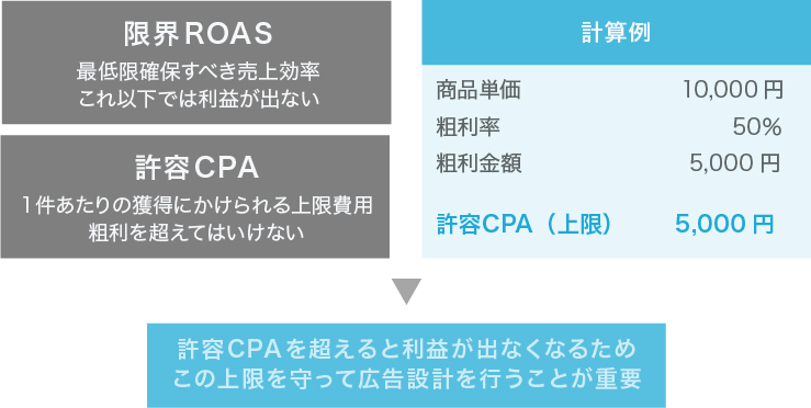 商品単価が1万円で粗利率が50%の場合、粗利は5000円となります。このとき、1件の獲得にかけられる最大の広告費、すなわち許容CPAは5000円が上限です。これを超えると利益が出なくなるため、ここを超えないように広告設計をしなければいけません。