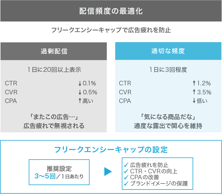 配信頻度の最適化も重要な要素です。同じユーザーに過剰に広告を表示しすぎると、広告疲れを起こし、CTRやCVRが低下するリスクがあります。これを防ぐためには、フリークエンシーキャップを適切に設定し、一定期間内の表示回数を制限するようにしましょう。