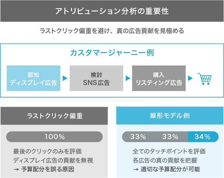 よくある誤りは、ラストクリックだけで成果を判断してしまうケースです。たとえば、リスティング広告での最後のクリックがCVを生み出していたとしても、その前段でディスプレイ広告によってブランドを認知していた可能性は十分にあります。ラストクリック偏重ではディスプレイ広告の貢献が過小評価され、適切な予算配分が難しくなるでしょう。