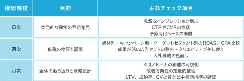 ディスプレイ広告の費用対効果を最大化するには、定期的なパフォーマンスチェックが欠かせません。広告配信は一度設定して終わりではなく、日々変化するユーザー行動や媒体アルゴリズムに合わせて柔軟に調整する必要があります。そのため、確認のタイミングを日次、週次、月次といった周期に分け、それぞれの目的を明確にしておくと管理が効率的です。