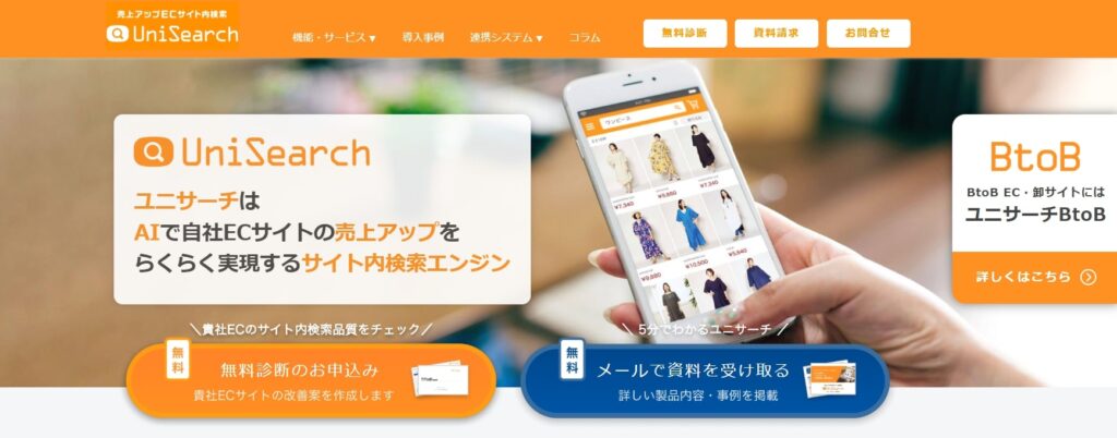 一方、ECサイトを中心に人気を集めているのが「ユニサーチ」です。基本的なサイト内検索や絞り込み、サジェストといった機能に加え、AIがユーザーのサイト内行動を分析し、購入されやすい商品を自動で上位に表示するパーソナライズ機能を搭載しています。これにより、検索結果がユーザーごとに最適化され、意図に即した商品が見つかりやすくなり、購入率の向上につながります。