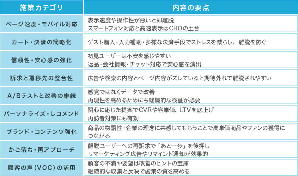 特に以下のような改善施策は、CVRを直接押し上げる効果が期待できます。