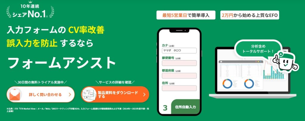 また、フォームアシストではツールの導入支援だけでなく、フォームのデザイン調整や分析サポートまでベンダー側が対応するため、自社に専門知識がなくてもスムーズに導入可能です。初期費用ゼロ、月額2万円からという導入コストの手頃さも、多くの企業に選ばれている理由のひとつです。