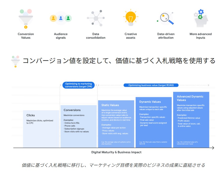 さらに、この価値設定をもとに「Maximize Conversion Value」や「Target ROAS」(どちらも価値ベースの入札戦略)を選ぶと、Google AIが自動でその条件に当てはまる「価値の高い顧客」に予算を集中させます。その結果、既存顧客のLTVを最大化できます。