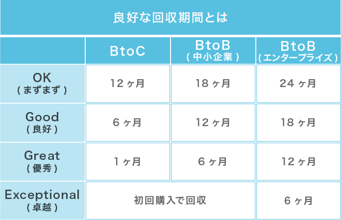 米国の著名なテックライターLenny Rachitsky氏の「Lenny’s Newletter」の記事によると、望ましいCACの回収期間について中小BtoBなら6カ月未満は最適、12カ月は良好、18カ月は許容範囲とあります。大手を含むBtoBであれば2カ月未満は最適、18カ月は良好、24カ月は許容範囲という調査結果が出ています。