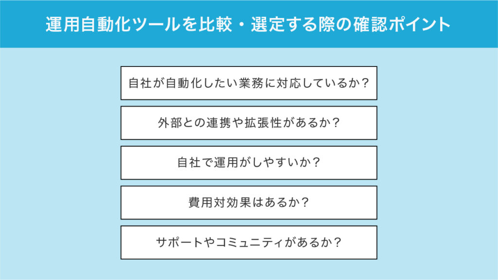 運用自動化ツールを導入する際には、機能や価格を並べて比較するだけでは不十分です。自社の業務環境や成長フェーズに応じて本当に活用できるかどうかを、多角的に確認する必要があります。ここでは代表的な5つの観点を解説します。