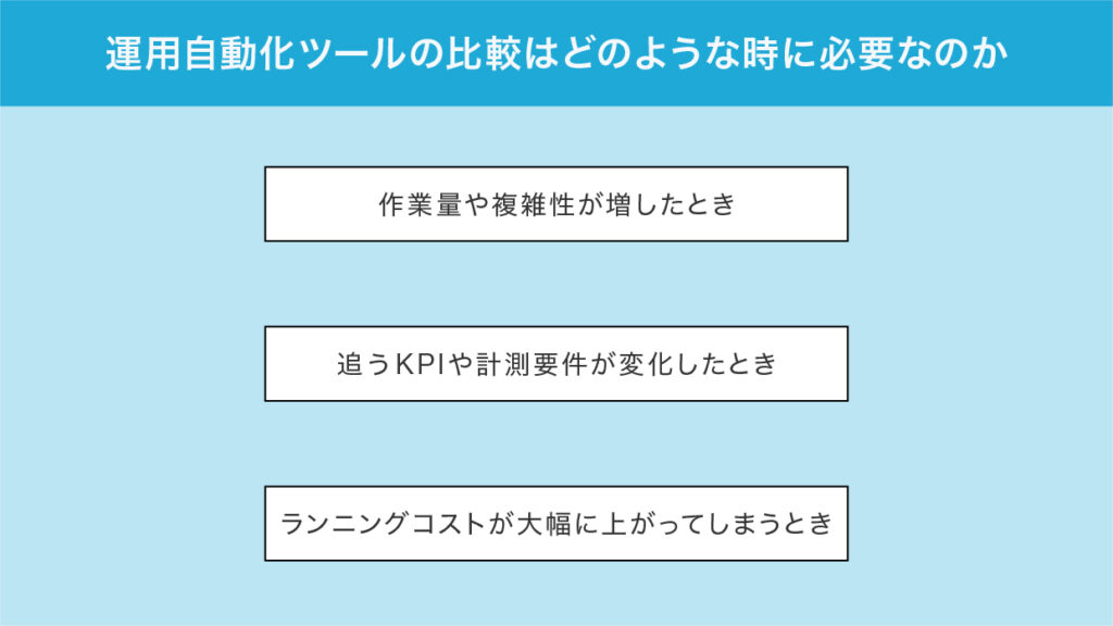 運用自動化ツールは、すべての企業に必ずしも導入が求められるものではありません。状況によっては、導入しても期待した成果につながらない場合もあります。では、どのようなケースで比較検討が必要になるのでしょうか。ここでは、その代表的な3つのシーンを解説します。