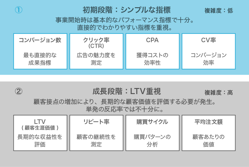 たとえば広告運用では、初期段階であればコンバージョン数やクリック率といったシンプルな指標を追うだけで十分なケースが多々あります。しかし、事業の成長に伴い顧客接点や販売チャネルが増えると、KPIが高度化することは珍しくありません。
