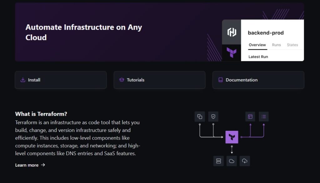 Terraform(テンフォーマー)は、HashiCorpが開発したインフラ構築・管理の自動化ツールであり、「Infrastructure as Code(IaC)」を代表する存在です。サーバーやネットワーク、クラウド環境の構成をコードで定義し、繰り返し安全にデプロイ・変更・削除できる点が特徴です。