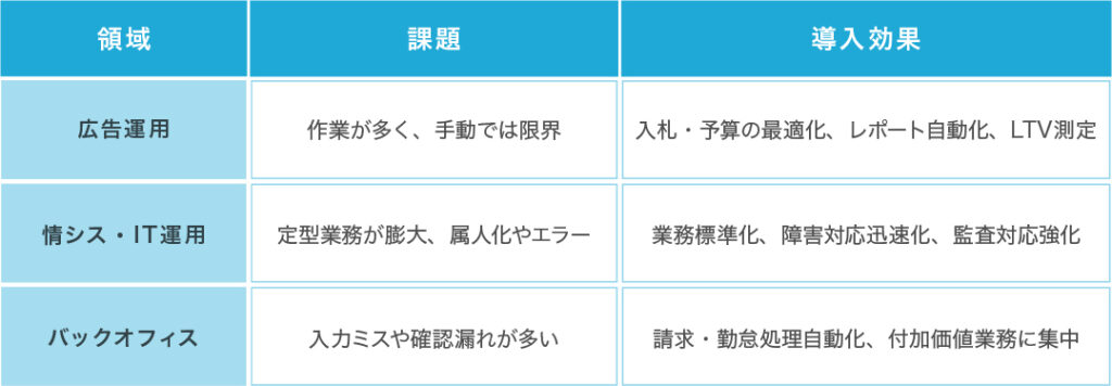 ここでは、広告運用、情シス・IT運用、バックオフィスという3つの領域に分けて、導入の意義を整理していきます。
