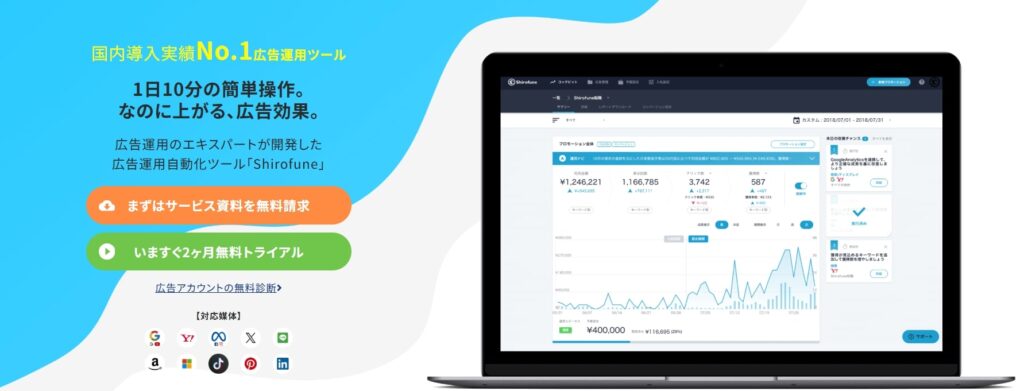 Shirofuneは「1日10分でプロ品質の広告運用」を実現する国産の広告運用自動化ツールです。Google広告・Yahoo広告・Meta広告・Amazon広告など主要媒体を横断的に管理し、媒体ごとのデータを自動統合してレポート化できるため、従来は数時間かかっていたレポート作成がワンクリックで完了します。