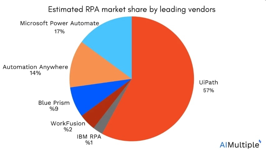まずはRPA(Robotic Process Automation)から見ていきましょう。AIMultipleによる、検索数やレビューをもとにした2025年8月時点のデータでは、UiPathが全体の57%のシェアを獲得しています。