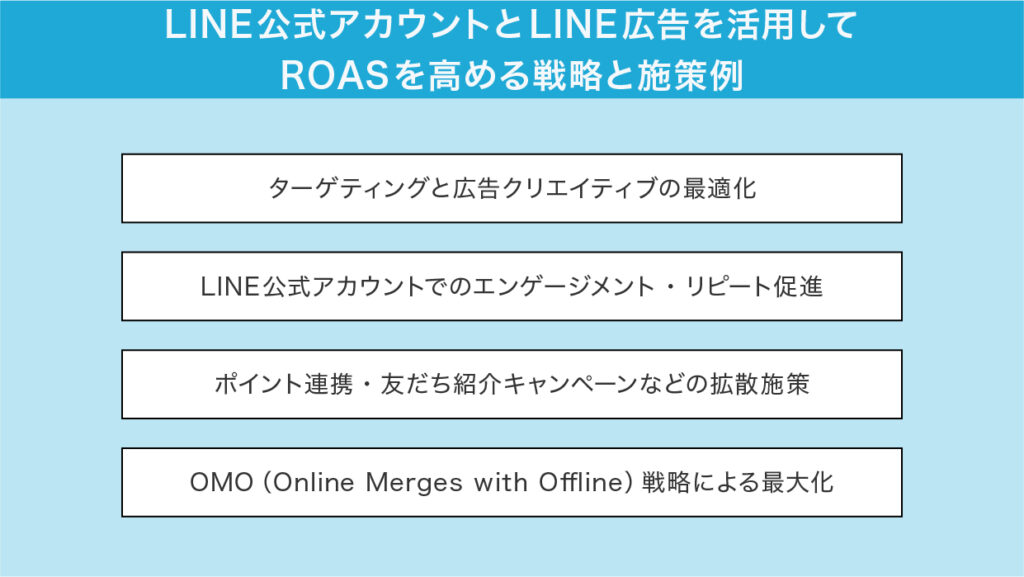 LINEは広告と公式アカウントという両輪を持つメディアであるからこそ、広告による新規接点の獲得から、アカウントを通じた関係構築、リピーター化、LTV最大化まで、すべてを一貫して実行できます。そこで以下では、ROAS向上のために取り組むべき代表的な戦略と具体的な施策を紹介していきます。