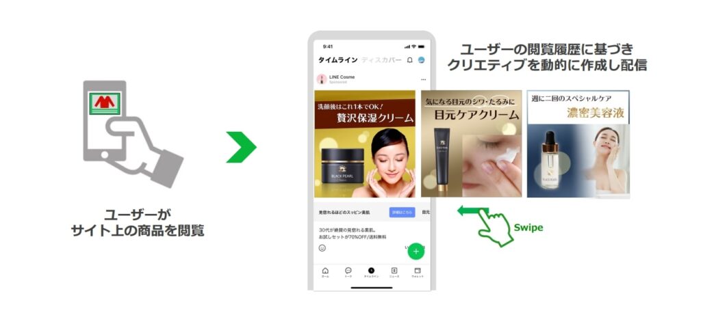 LINE Dynamic Ads(動的広告)とは、ユーザーの過去の閲覧履歴や興味関心に応じて、自動で最適な商品を選び、広告として表示する機能で、商品点数の多いECサイトなどでは特に効果を発揮します。