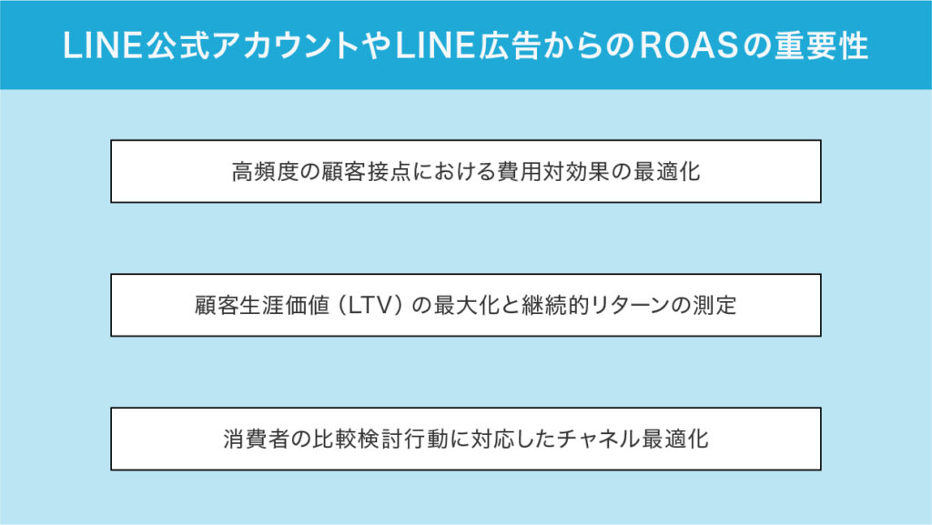 LINE公式アカウントやLINE広告は、他のSNSや検索広告とは異なり、顧客と継続的かつ多層的に関係を構築できる点が特長です。単発の広告反応ではなく、時間をかけて形成される購買行動の中で、「どの施策が、どれだけのリターンを生んでいるのか」を可視化しなければ、次の打ち手が見えてこないのです。以下では、LINEにおけるROASの重要性を、3つの視点から深掘りしていきます。