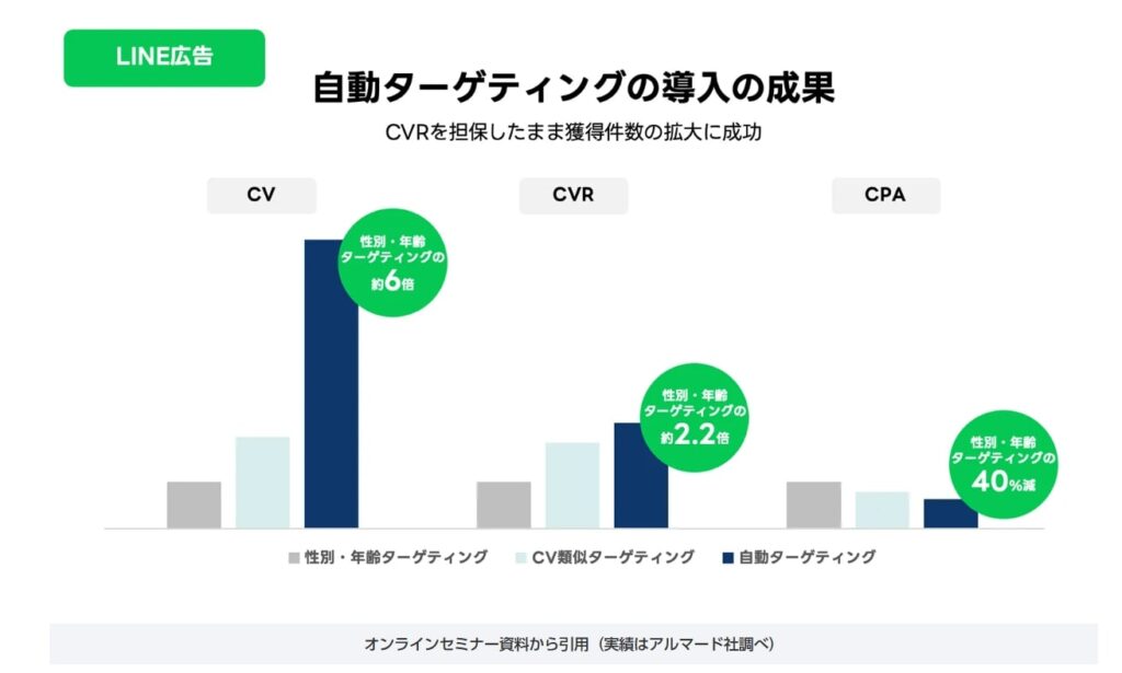 LINE広告では「自動ターゲティング」を活用し、ユーザーの興味関心や行動履歴に応じた配信を実施。その結果、従来の一斉配信と比較してコンバージョン数は6倍、CVRは2.2倍に向上し、CPAも40%削減されました。初回購入だけでなく、定期購入への移行率も改善され、LTVベースでのROAS向上につながっています。
