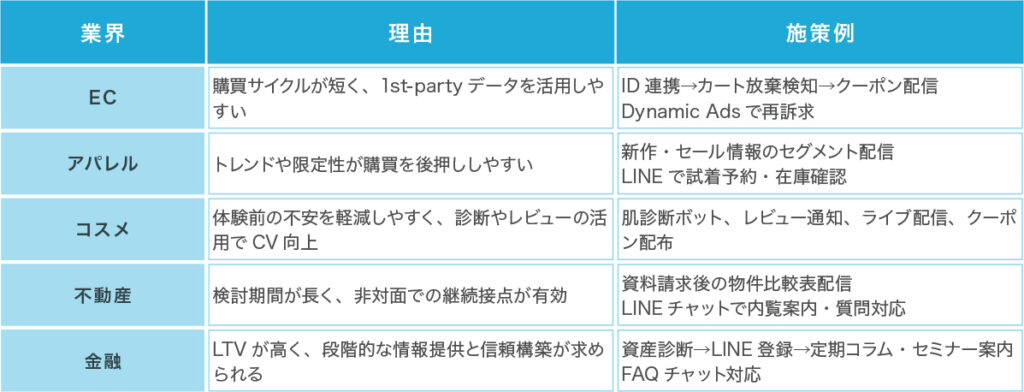 平均購買サイクルが短く、ユーザーの意思決定から購入までの期間が限られているため、LINEを活用したタイムリーなリマインドやプロモーションは売上げに直結しやすい特徴があります。また、EC事業ではユーザーの購買履歴や閲覧情報が自社に蓄積されており、ファーストパーティーデータを活用したリターゲティングや、CRM施策の精度向上が見込めるでしょう。