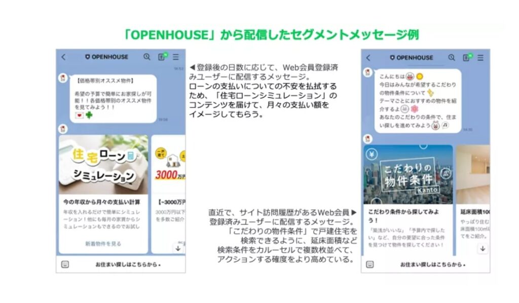 不動産業界は、検討期間が長く、意思決定に多くの情報と比較が必要な業界です。LINEのような継続接点型のチャネルが効果を発揮するといえます。購入や賃貸の意思決定には、価格や立地、設備仕様といった物理的条件に加えて、信頼性、サポート体制、周辺環境といった定性的な情報も求められるため、ユーザーとの信頼関係を育む長期的なコミュニケーションが成果に直結します。