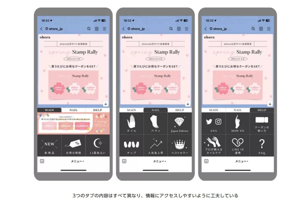 メッセージ配信は週1〜3回。親しみやすいトーンのクリエイティブやカード型メッセージ、リッチメニューを活用し、月1〜2回デザインを更新しています。初回クーポン配信や診断機能、ステップ配信による商品案内など、多様な接点を設計しています。