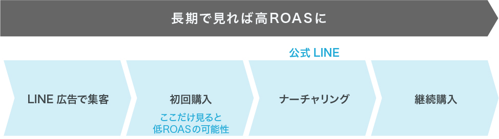 さらに、SNS広告におけるROASは短期的な数値だけでは評価しきれません。LINEのような高頻度接触型チャネルでは、一度の広告接触が将来の売上げにどう影響するかといった中長期的視点も加味し、リピート率やLTV(顧客生涯価値)とセットで評価することが重要です。