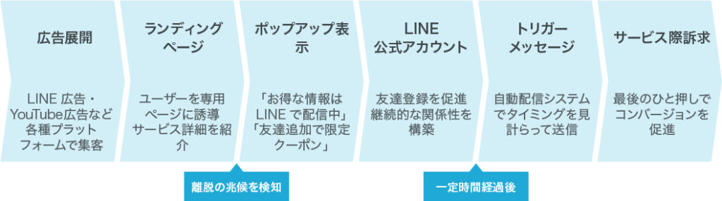 たとえば、LINE広告やYouTube広告からLPに誘導し、離脱の兆しが見えたタイミングで「お得な情報はLINEで配信中」「今すぐ友だち追加で限定クーポン進呈」といったポップアップを表示し、LINE公式アカウントへの登録を促します。その後、友だち登録したユーザーに対して、一定時間(例:6時間後や翌朝など)を空けてトリガーメッセージを自動配信。再度サービスを訴求し、決め手に欠けていたユーザーに対して最後のひと押しを行うのです。