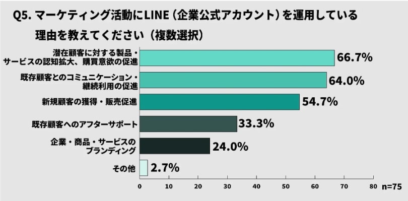 運用理由としては、「潜在顧客への認知拡大と購買意欲の促進」(66.7%)が最も多く、次いで「既存顧客とのコミュニケーションおよび継続利用の促進」(64.0%)が挙げられています。