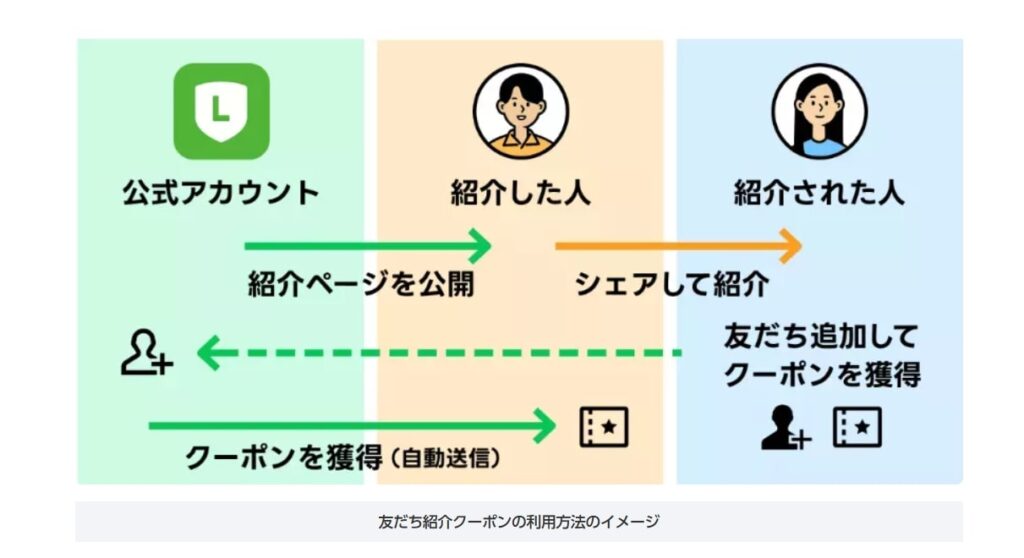 もうひとつ、広告費をかけずにユーザーを増やす強力な仕組みが、LINE公式アカウントの友だち紹介クーポンです。この施策では、既存の登録者に対し、「お友だちをご紹介いただくと、あなたとお友だちの双方にクーポンを進呈します」といったインセンティブを提供します。