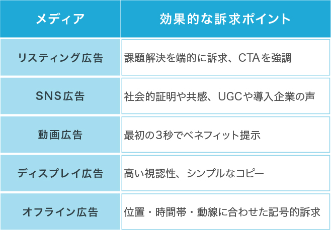 以下は、主要なメディア別に効果的とされる訴求ポイントの一例です。