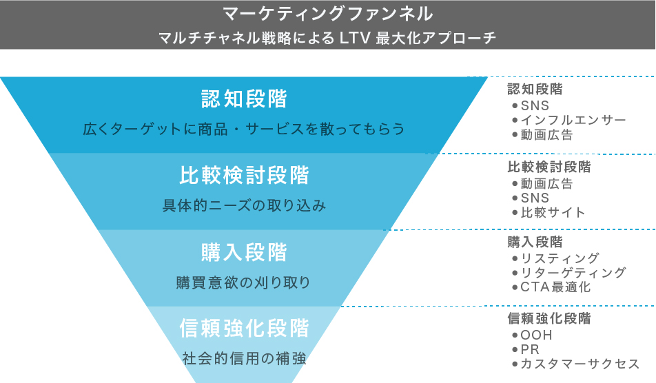 さらに視点を広げれば、認知段階ではSNSで潜在層にブランドを刷り込み、比較検討段階では検索広告で具体的ニーズを取り込む。そして購入段階ではリスティングやリターゲティングで刈り取り、信頼強化の段階ではOOHやPRで社会的信用を補強する。こうした複数チャネルを組み合わせた設計は、LTV向上に直結します。