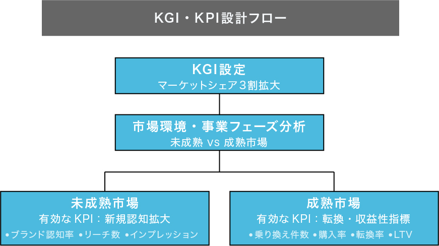 「マーケットシェア3割拡大」をKGIに掲げた場合、市場が未成熟であれば新規認知拡大が有効なKPIとなります。一方で、すでに一定の認知を獲得している成熟市場では、競合からの乗り換え件数、購入率や転換率、さらにはLTVといった指標のほうが、より直接的に成果を規定します。つまり、市場環境や事業フェーズに応じてKPIは変動するという前提を持つことが重要です。