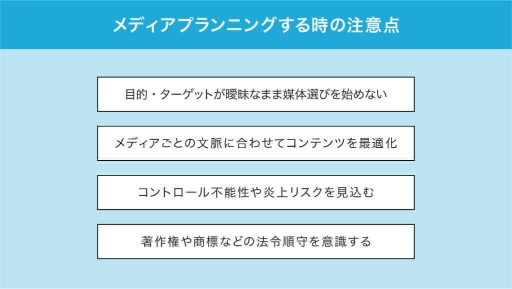 ここでは、実際にメディアプランニングを行う際に多くの企業が見落としがちな注意点について、4つの視点から解説します。